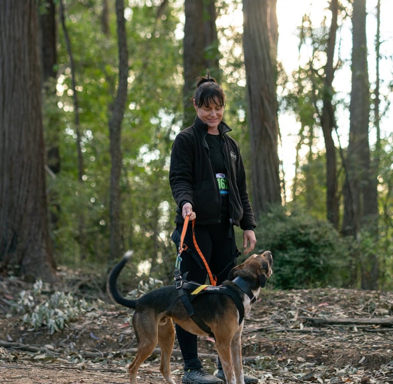 I'm Sharnie, a dog trainer who is passionate about ensuring our dogs are given adequate biological fulfillment and enrichment opportunities. As such the sport of Canicross was a natural progression for me. I love spending time in nature running and hiking with my two dogs Baaka and Tigger and ‘The Canicross Club has helped us take this passion to the next level with the competition side of things. As far as dog sports go, canicross is accessible for most people and dogs, your dog doesn’t even need to be able to walk nicely on leash, in fact not being able to is an advantage. Running is so natural to dogs and I love how my dogs significantly increase my run speed time by pulling me along the trail and help me keep going when it gets hard, especially up the hills.